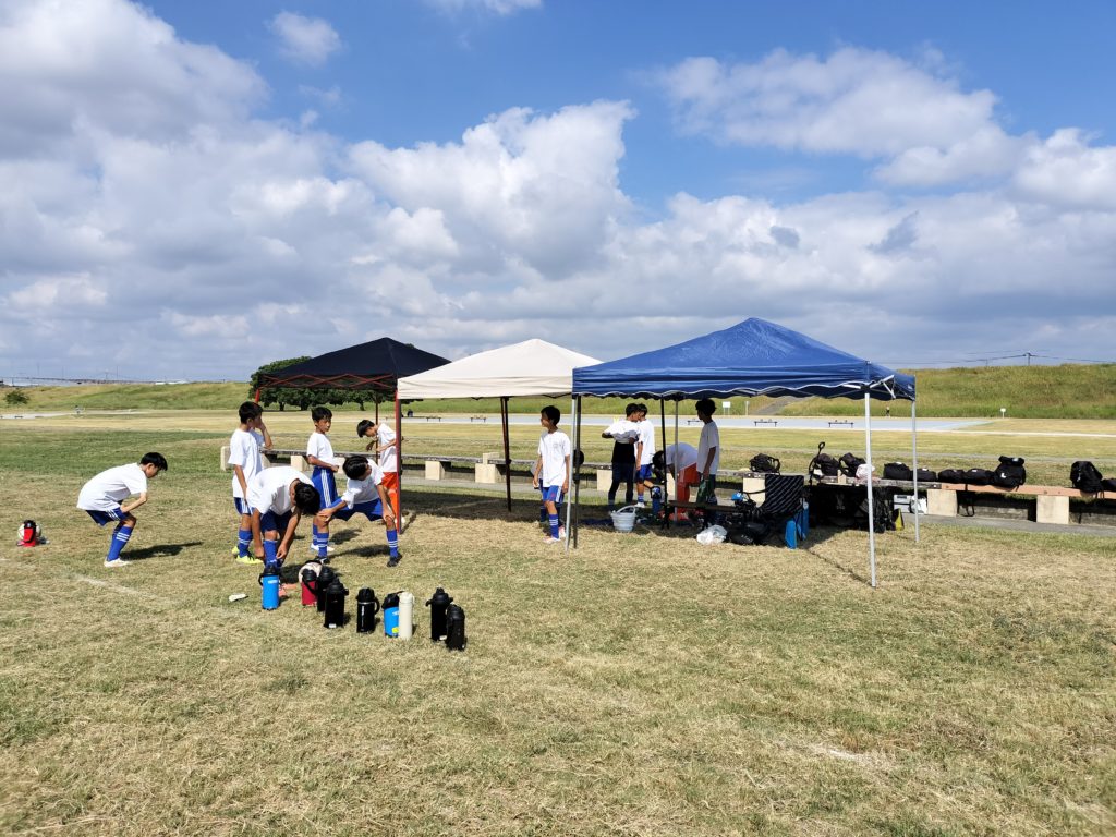 日曜日はAM・U14TMに帯同。高槻FCとのゲーム。テントを3基準備して、大量の氷も準備して、暑熱対策に気を使いながらの実施。