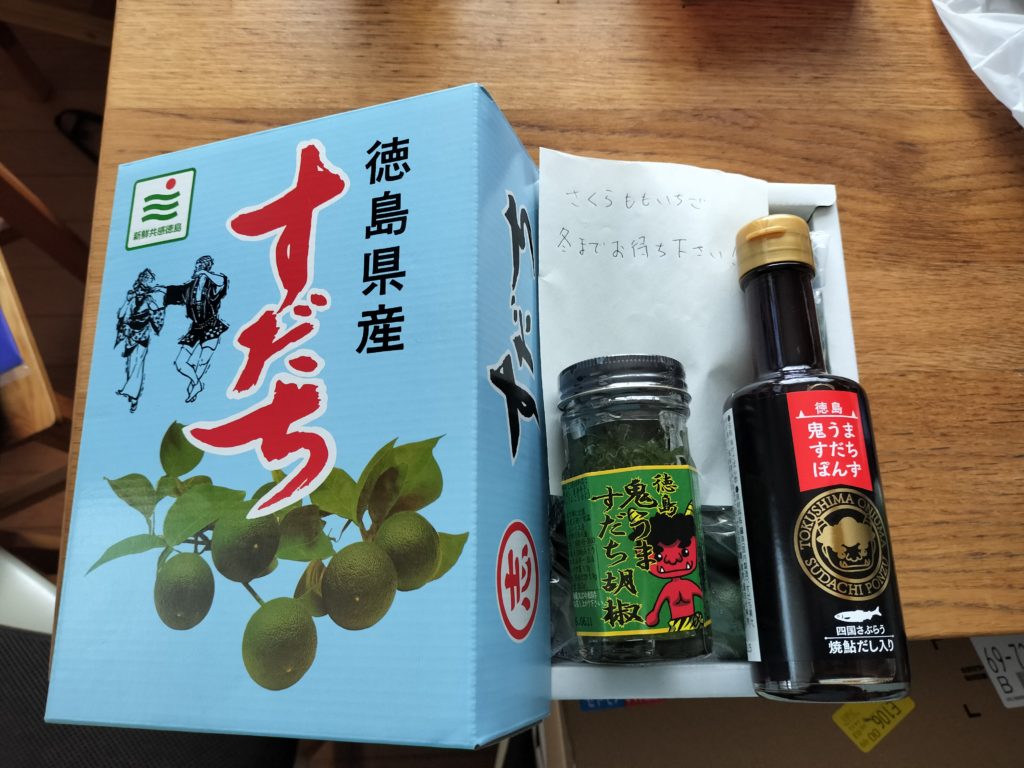 家に帰ると、徳島の手下(本人から手下と呼んでくれ。と言われています。いろいろ難しい時代ですので補足)の籔から、すだちと変わった現地特産物を送って来てくれました。いつも俺に送られてくるものには名前に「鬼」がついてる気がするけど、俺にあてつけてきてるのか?彼にそういう「前振り」のセンスはないはずなので、パートナーのアドバイスか、たまたまか、徳島県人には「鬼」が精いっぱいのお笑いフィニッシュブローなのか・・・。「さくらももいちごは冬までお待ちください」のメモとともに・・・。やぶ~気ぃつかわんといてや。6人家族で~す。4人の女子はフルーツ大好きで~す。こっちからも着払いで、しょーもないもん送ると思います。知らんけど・・・・。